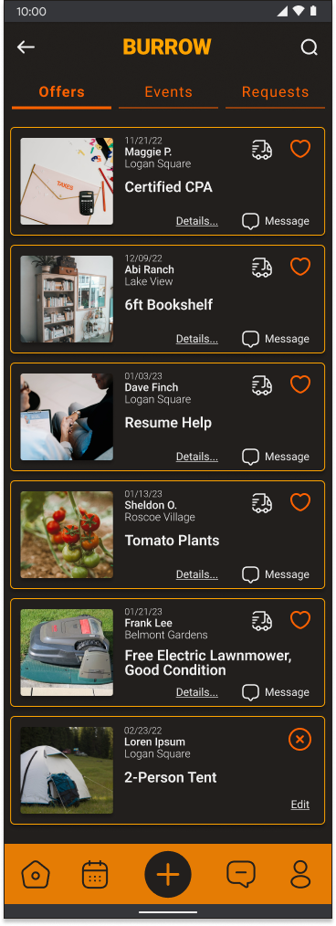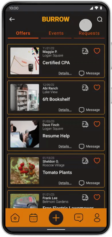 The new and improved homepage uses a three category tab selector so that users can quickly view offers, events, and requests. These lists can be filtered or sorted in a number of ways, can be added to a calendar, or shared with a friend.