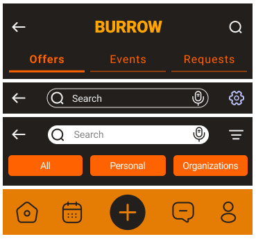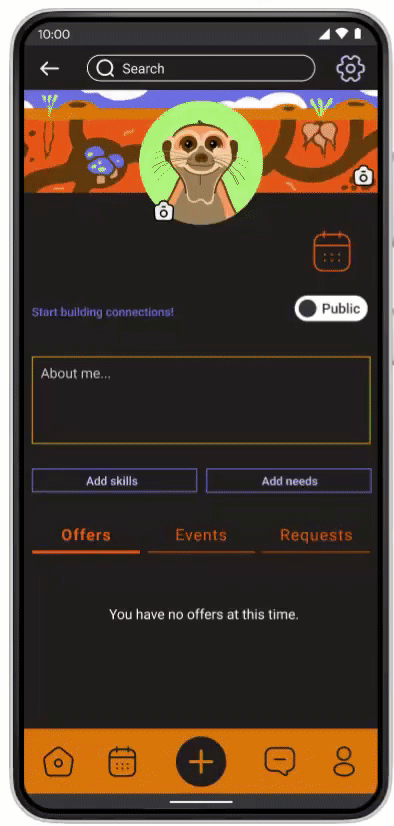 From the homepage, users can explore offers, events, and requests using a filter menu and search bar. Additionally, a navigation bar can quickly take users to their profile, calendar, or messages.