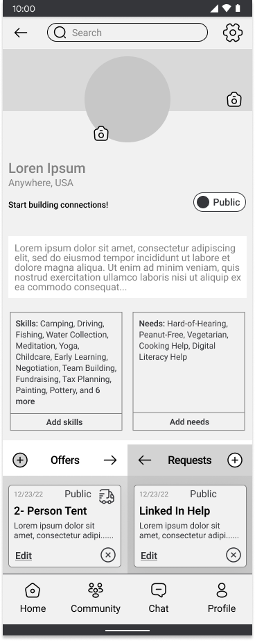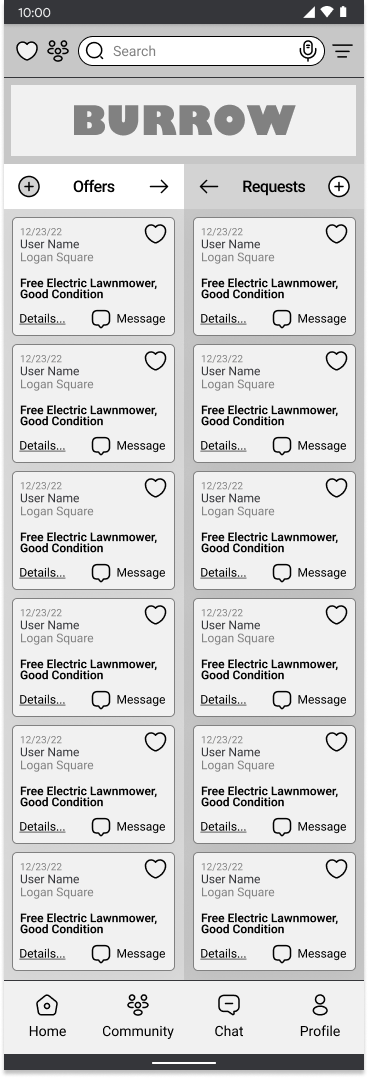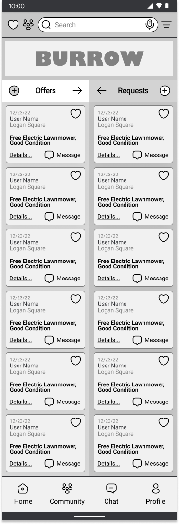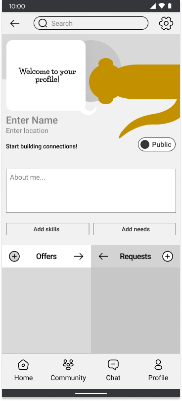 A tab category selector should be added to the profile and home pages so that offers and requests are displayed one at a time. A third category called “events” will replace the community page.